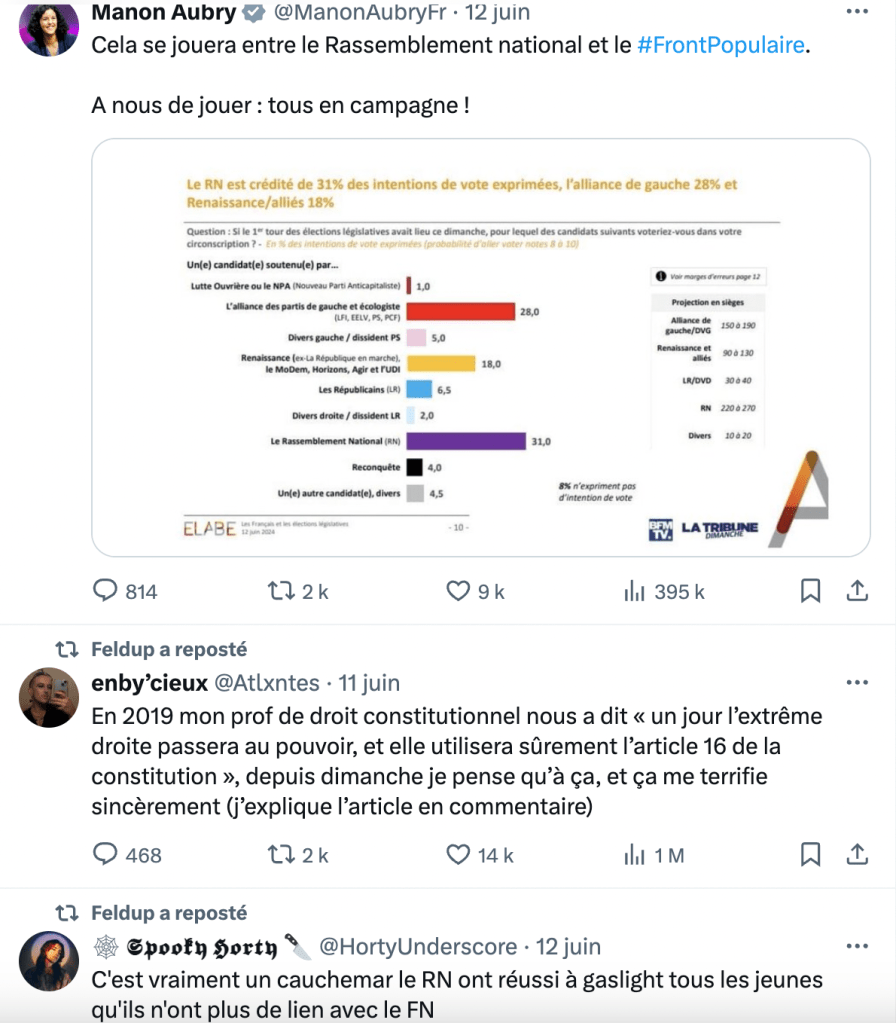 I.els sont également signataires d’une tribune publiée le 17 juin sur le Club de Mediapart rassemblant 300 personnalités du monde d’internet qui s’engagent publiquement contre l’extrême droite4. De nombreuses créateur.ices de contenus ont pris la parole contre le Rassemblement National durant cette période et/ou embrassé leur rôle en tant que relais d’informations. En faisant circuler des appels aux votes, en déconstruisant le programme du RN, comme l’a fait dans une vidéo Crazy Sally, ou en prenant position politiquement pour la première fois comme Squeezie. « Je n’avais jamais vu autant de mobilisation politique sur internet pour une élection, c’est assez exceptionnel », avait commenté le streameur Ponce (propos recueilli par l’AFP)5.
