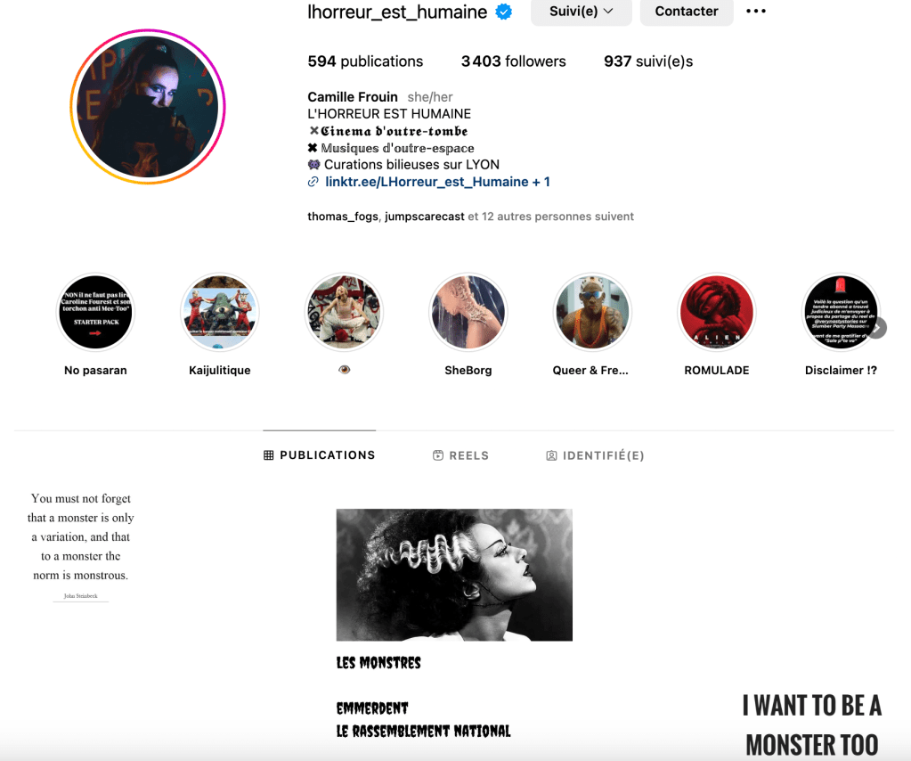 L’horreur est donc une caisse de résonance politique, ce qui se ressent également dans sa pratique en ligne. Écho isolé de la bataille idéologique en cours en ligne lors des législatives, les prises de positions des créateu.rices cité.es pour la plupart très engagé.es sont également au quotidien en réaction d’un monde de l’horreur encore par aspect très conservateur. Ce dont témoignent en particulier les créatrices interrogées.