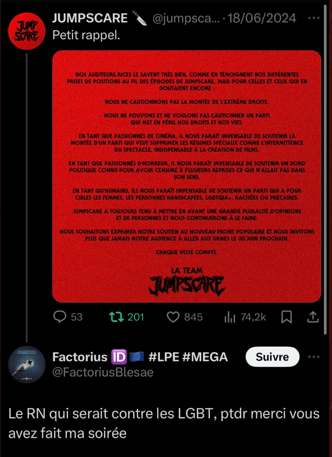 “ Nos auditeurs.ices le savent très bien, comme en témoignent nos différentes prises de position au fil des épisodes de JUMPSCARE, mais pour celles et ceux qui en doutaient encore : nous ne cautionnons pas la montée de l’extrême droite”. C’est sur ces mots que s’ouvre la tribune2 publiée le 18 juin sur X et Instagram du podcast JUMPSCARE3. Un podcast “qui aime les films d’horreur”, monté il y a un an et demi par une équipe de six passionné.es pour discuter cinéma de genre, d’horreur et d’épouvante.